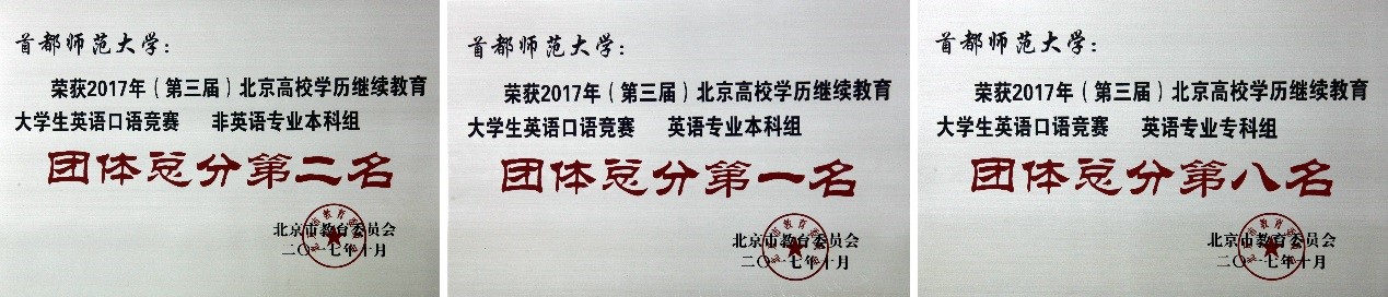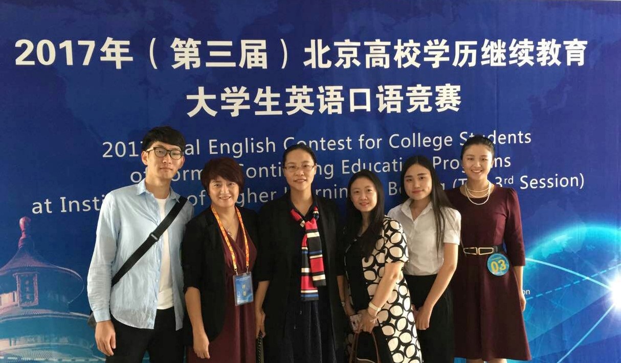近日北京市教育委员会公布了2017年(第三届)北京高校学历继续教育大学生英语口语竞赛决赛获奖结果,我校在本次竞赛中取得了喜人成绩,分别获得英语专业本科组团体总分第一名、非英语专业本科组团体总分第二名。在个人奖项上,管理学院的张晶、教育技术系的杨硕菁两位同学均获得非英语专业本科组一等奖;外国语学院的关斯芳、李咪咪、翟旭三位同学分别获得了英语专业本科组二等奖、三等奖和优秀奖。我们的三位指导教师隋忻、智娜、戎晓燕均获得了“优秀指导教师”的荣誉称号。